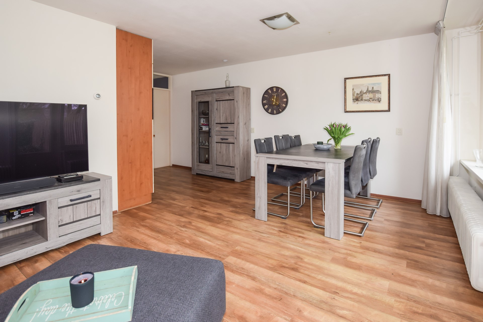 De sfeervolle woonkamer (afmeting: circa 3,80 x 5,20/6,70 meter) is gericht op de relatief diepe en door de zuid-west ligging ook zonnige achtertuin; ook de woonkamer is afgewerkt met een laminaatvloer.