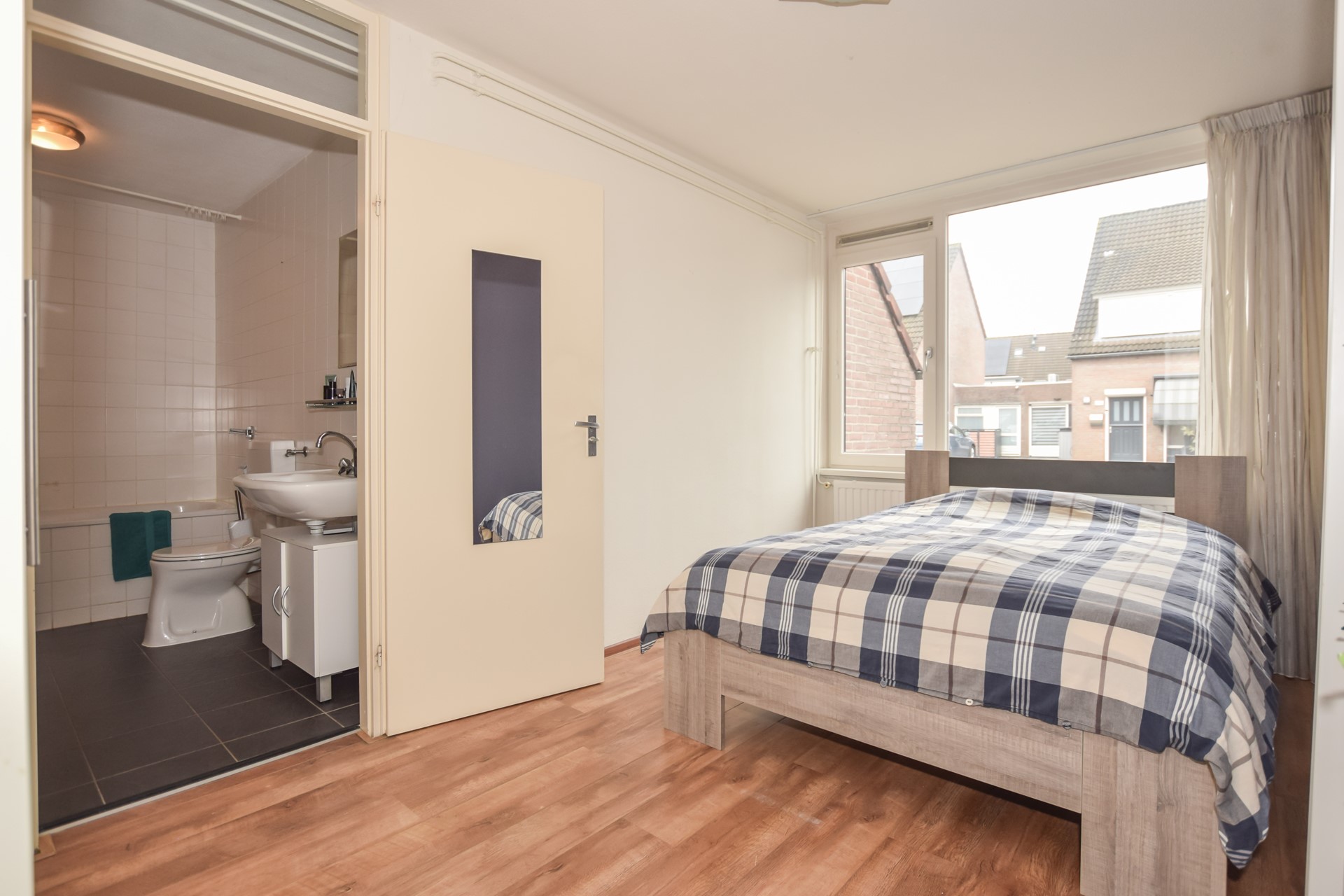 De ruime slaapkamer (afmeting: circa 4,55 x 2,66 meter) bevindt zich aan de voorzijde van het appartement en is voorzien van een laminaatvloer.