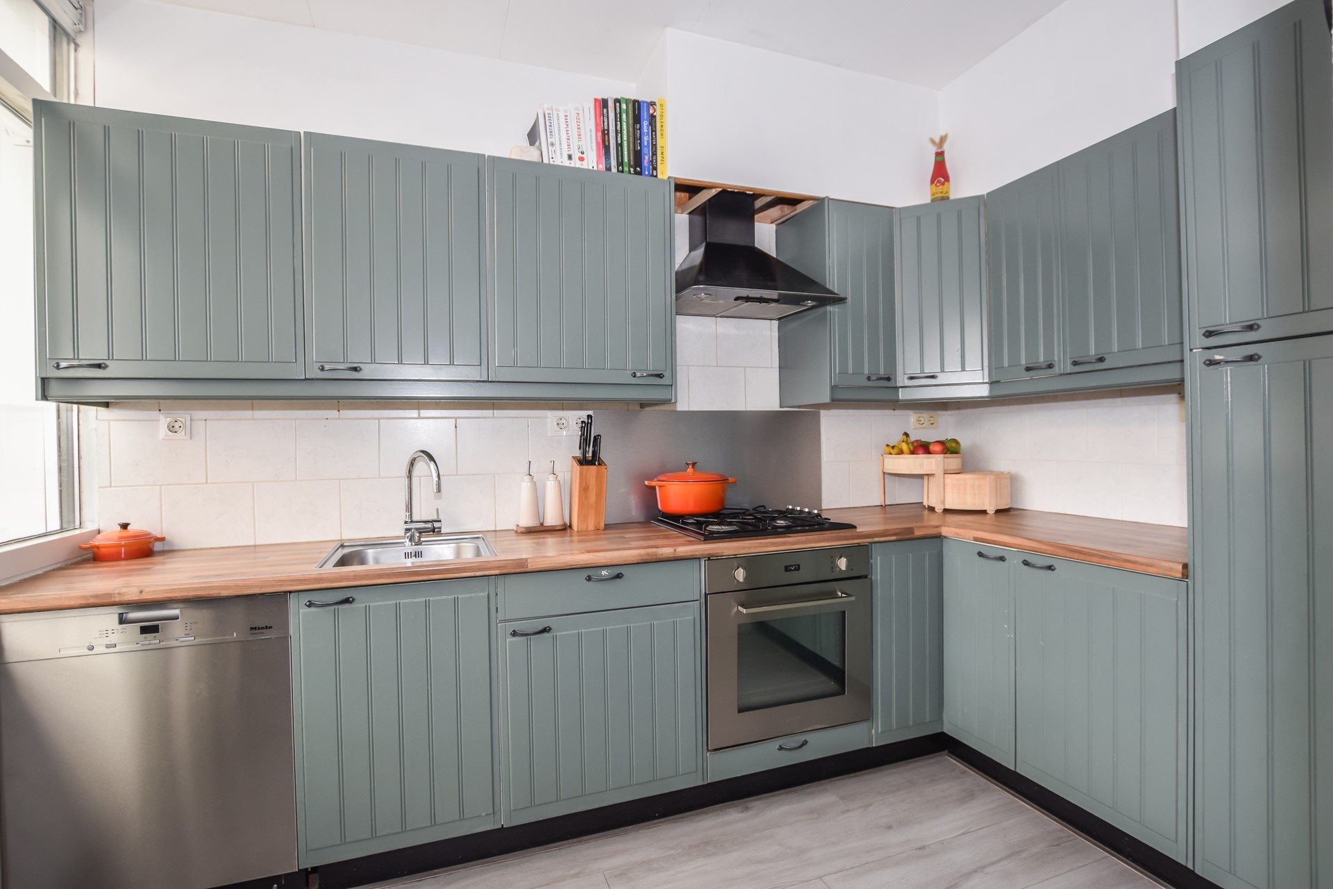 De halfopen keuken in hoekopstelling beschikt over voldoende kastruimte en diverse inbouwapparatuur, waaronder een vaatwasmachine, oven, gaskookplaat, afzuigkap en een in 2023 vernieuwde koelkast.