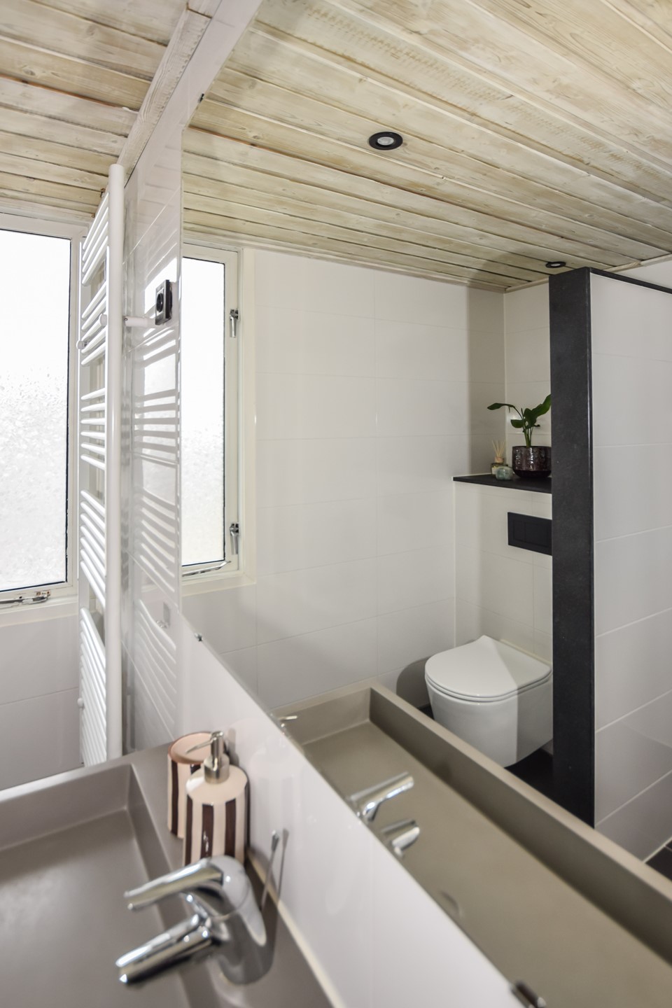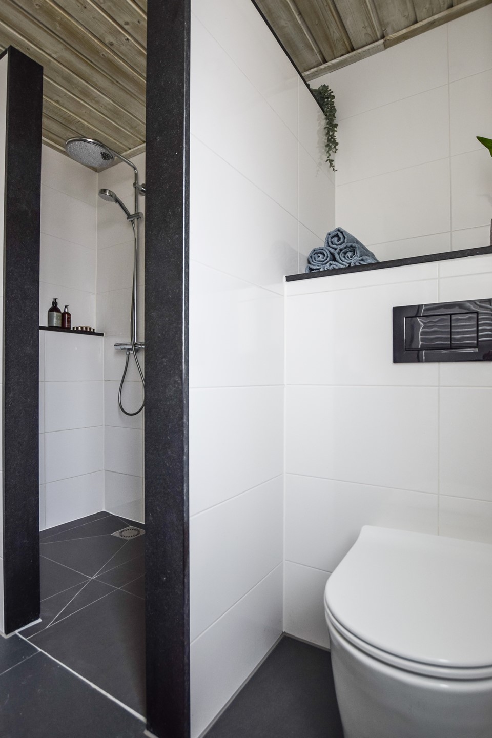 De badkamer is in 2023 volledig vernieuwd en modern uitgevoerd met een ruime inloopdouche met regen- en handdouche, een wandcloset en een wastafelmeubel met grote spiegel. De designradiator zorgt voor extra comfort.
